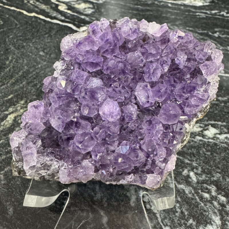L’améthyste est généralement de couleur violette, qui peut varier du violet pâle au violet intense. La nuance de la couleur est due à la présence de fer et à des radiations naturelles. Les pierres de qualité supérieure présentent des tons plus profonds et uniformes.