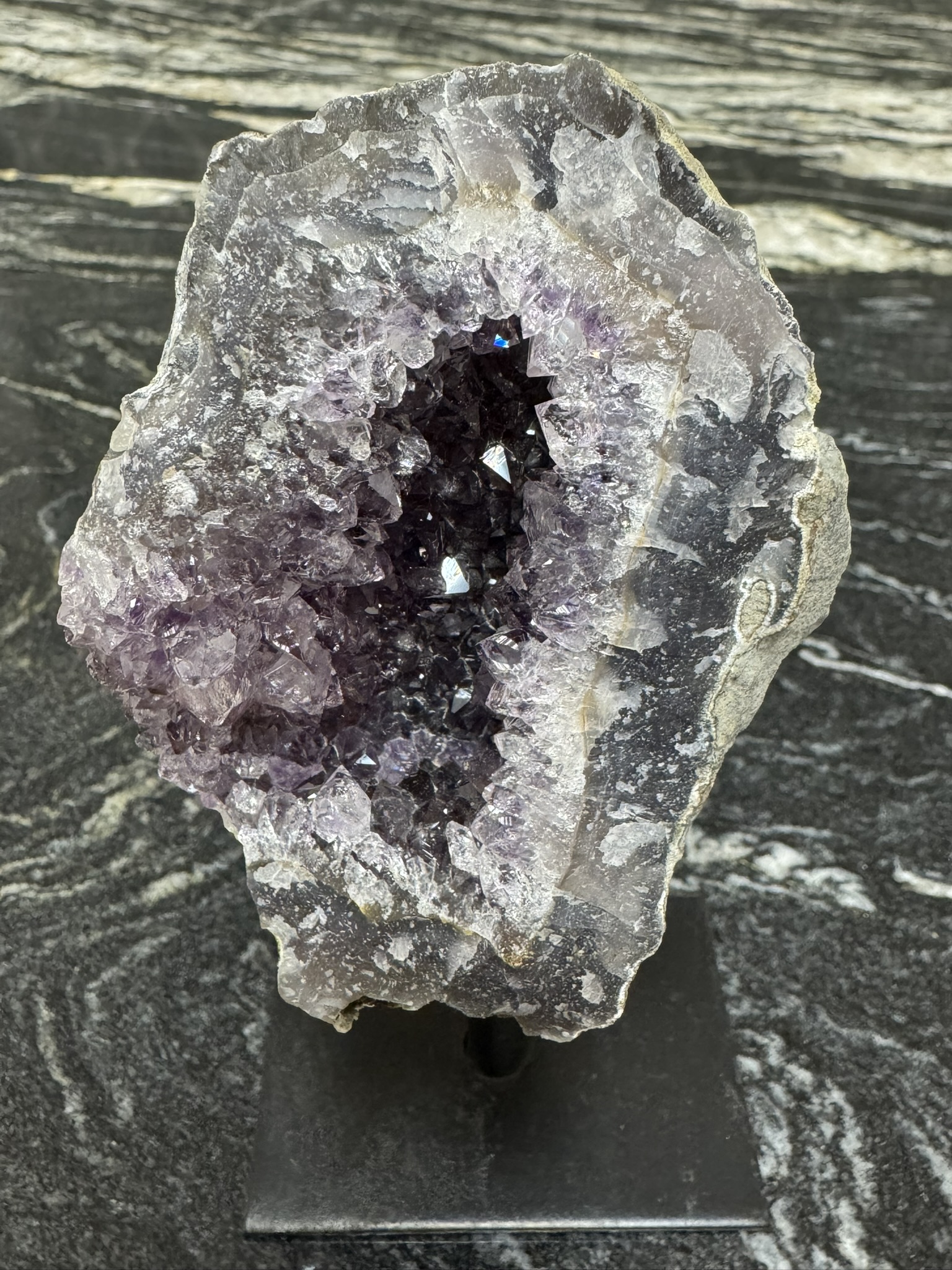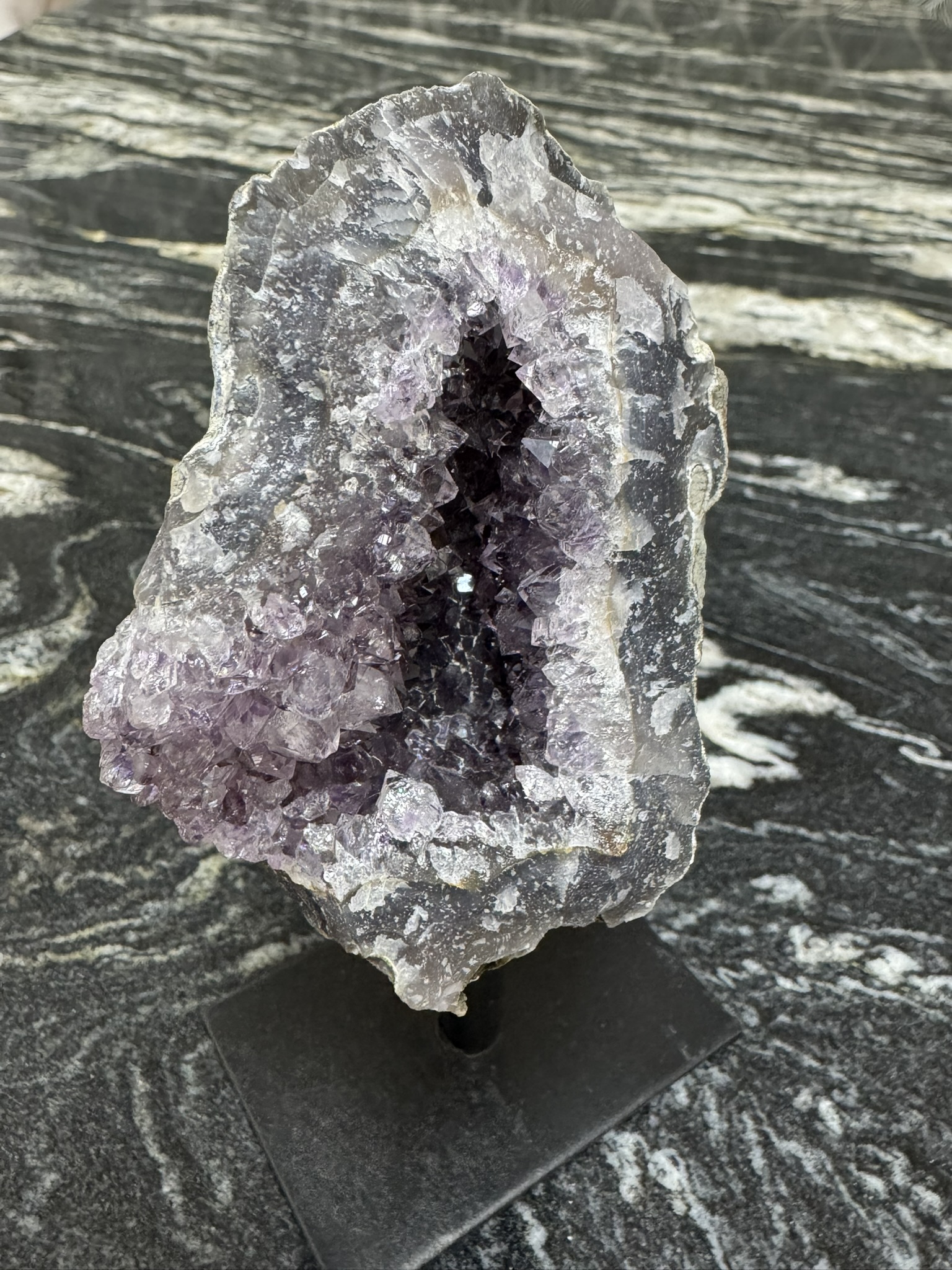 Cette géode d’Améthyste du Brésil, malgré son aspect extérieur un peu grisonnant saura vous séduire par l’intensité de ses petits minéraux qu’elle à développer à l’intérieur.