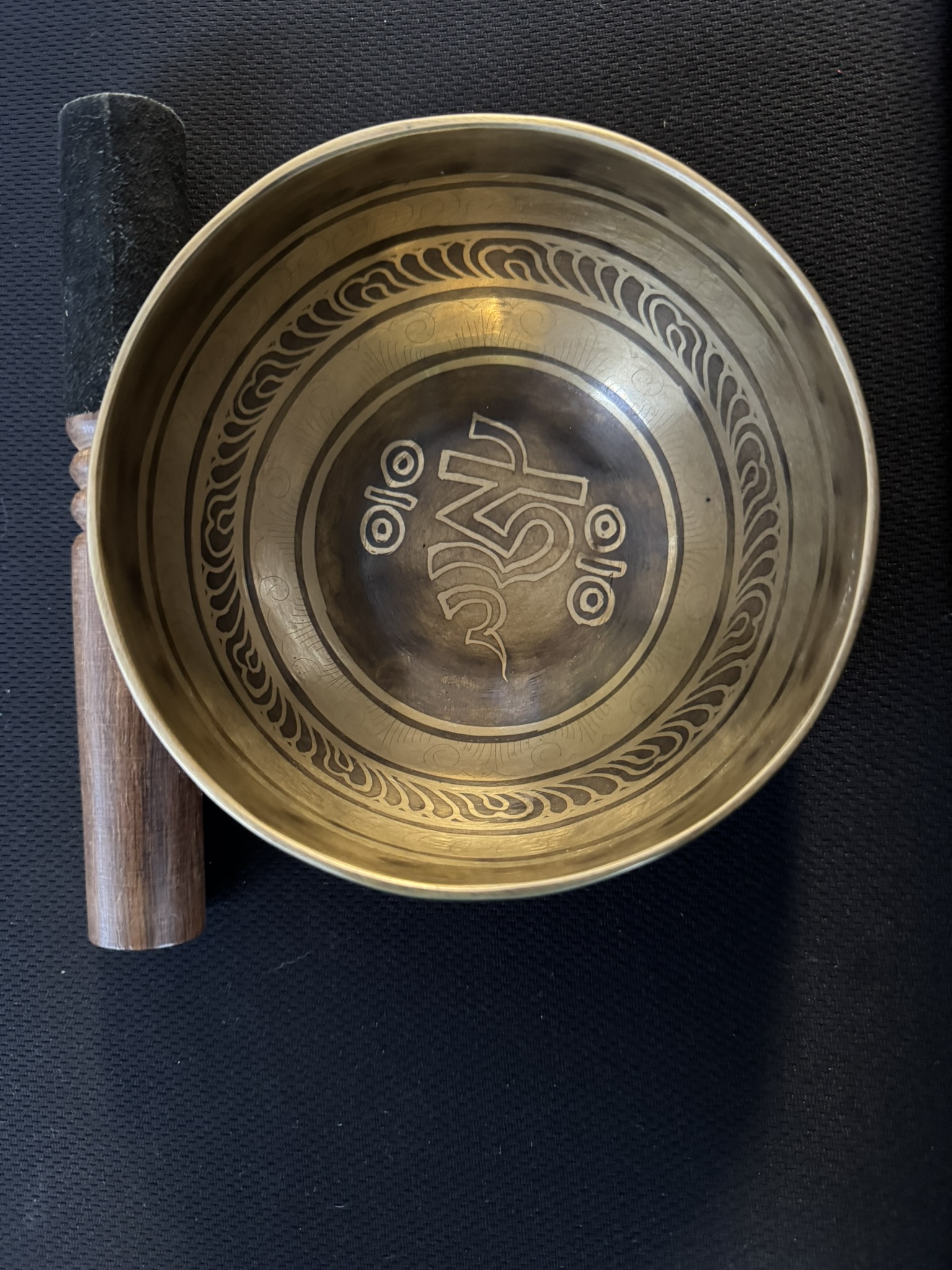 Bol chantant fabriqué manuellement par des artisans Népalais, ils sont composés de 7 Métaux : Or (petite quantité) Argent, Mercure, Cuivre, Fer, Étain, Plomb. Diamètre 13,5 cm x épaisseur 2 cm. Il est accompagné de son Maillet en Bois