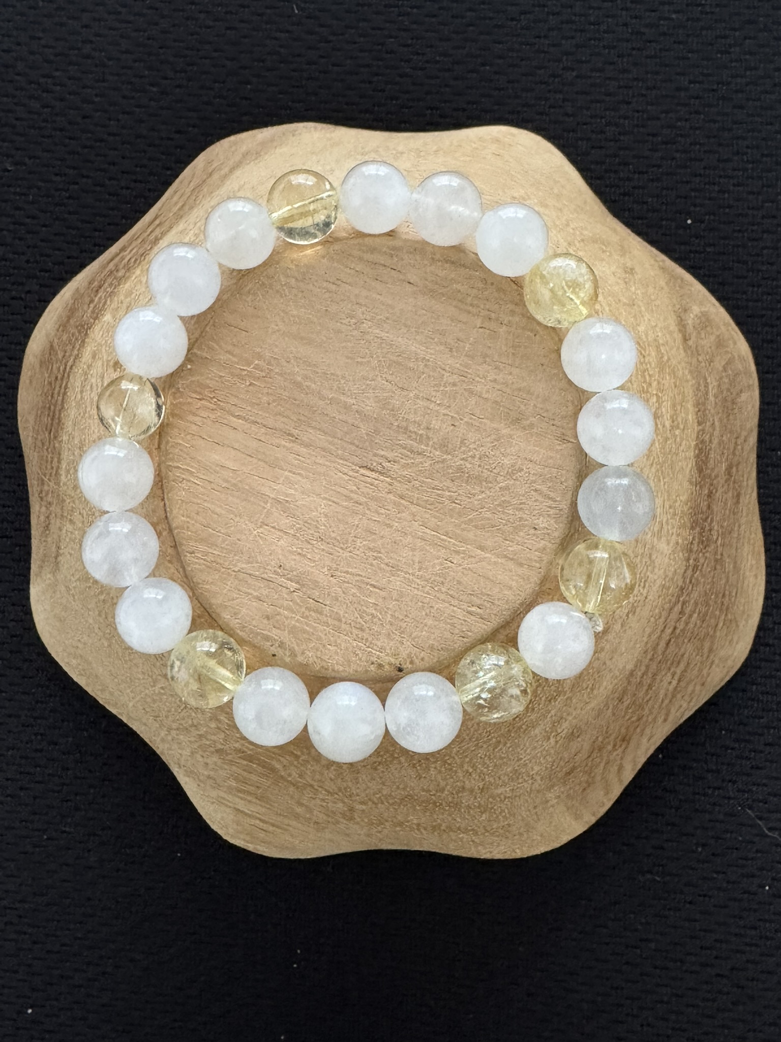 Il se compose de la pierre de lune indienne et de la citrine, il vous apportera la joie de vivre ainsi que les mini déprimes (vertu de la citrine), il vous aidera également à traiter les problèmes en relation avec le Féminin Sacré, il vous accompagnera lors du désir d’enfanter. Il vous accompagnera également lors de la venue de la Ménopause. (vertu de la pierre de lune).