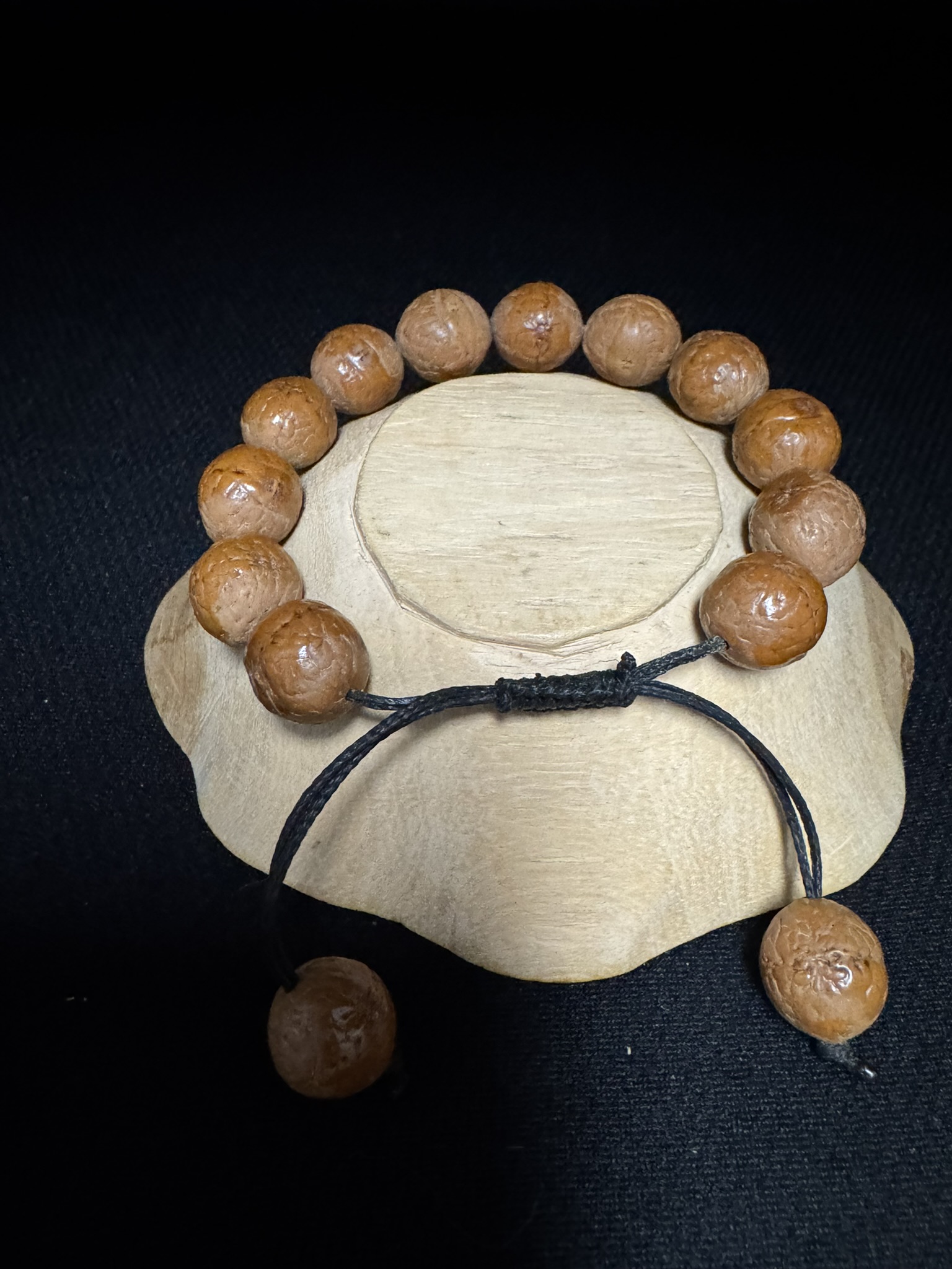 Le Bodhi est en fait le bois de Pipal (Ficus religiosa) il est appelé l’Arbre Bodhi, il est le symbole du Bouddhisme car s’est contre lui que Bouddha méditait quand il à atteint l’illumination. Il est également appelé l’Arbre de la sagesse ou l’Arbre de l’illumination, il est le plus sacré et le plus vénéré des Arbres aux Népal et en inde, comme dans le monde entier. Lorsque vous détaillé la perle vous pouvez découvrir une formation qui s’assimile au Yeux de Bouddha. Composé de 12 perles et deux pour le fermoir.