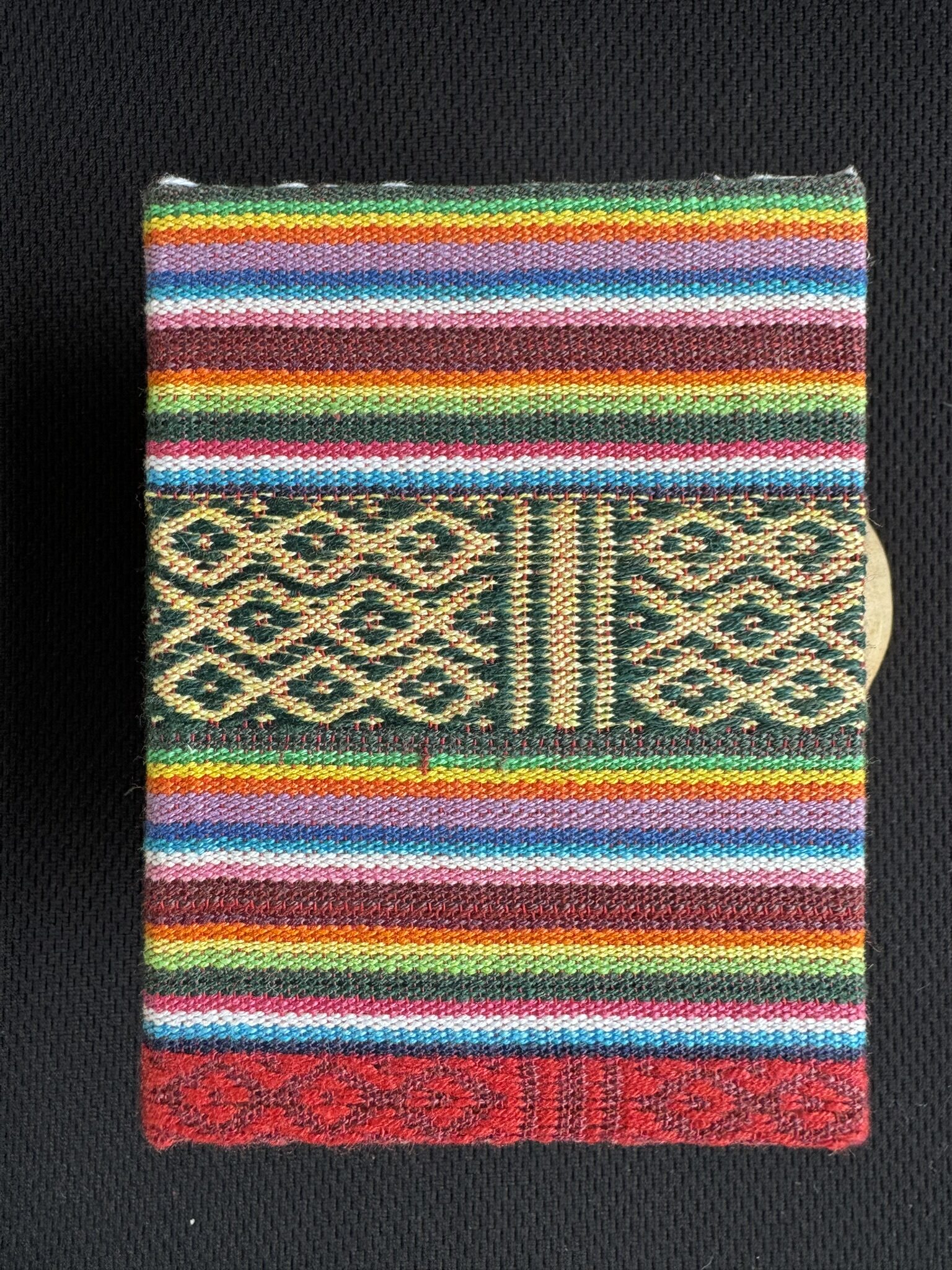 Petit carnet en parchemin fabriqué par des artisans népalais, mesures 11 x 8 cm 28 pages, couverture en tissus népalais, coton tissé jacquard à rayure coloré.