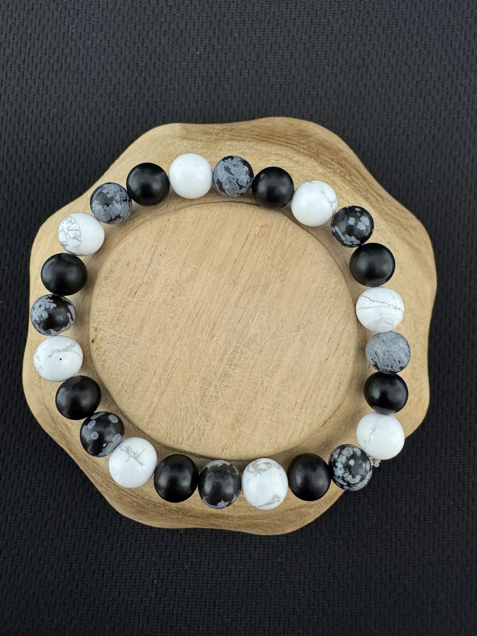 Il est composé de Howlite Blanche qui traitera votre stress, de l’Obsidienne Flocon de Neige celle de vos émotions en douceur, le Jais vous aidera à faire le deuil et le détachement du passé.