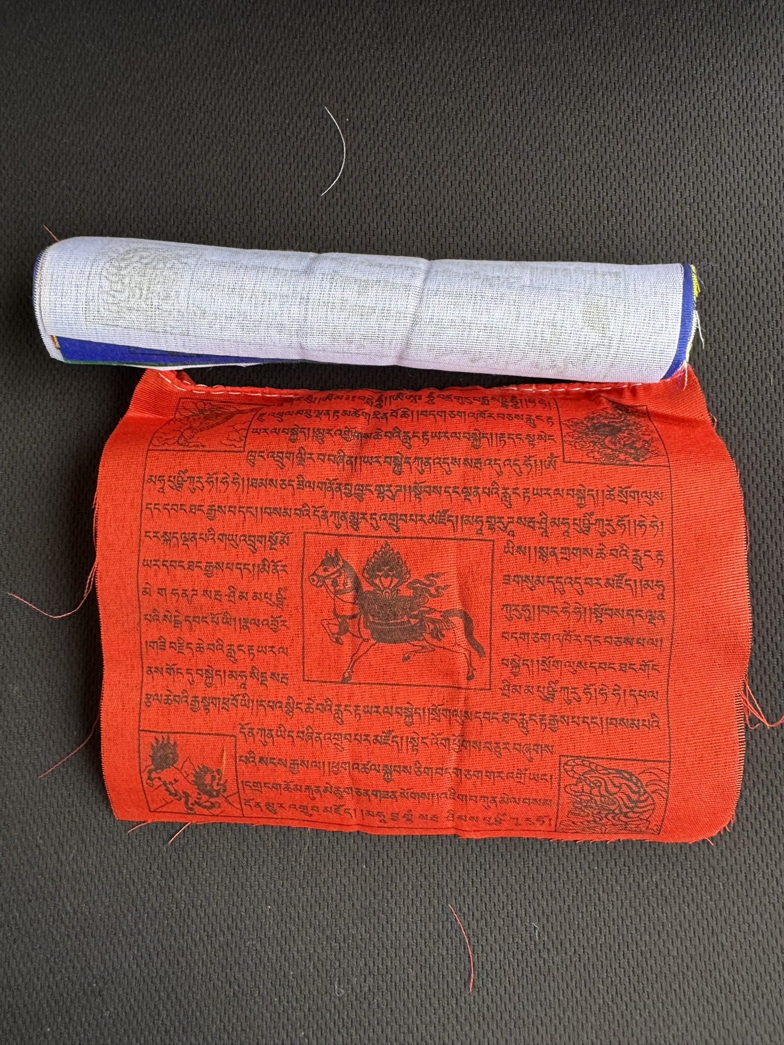 Drapeaux fabriqué par des artisans népalais, ils représentes : Paix, Compassion, Force et Sagesse, Prospérité. La couleur de chaque drapeaux représente le Bleu / le ciel, le Blanc / l’air et nuage, le Rouge / le Feu, le Vert / l’Eau, le Jaune / la Terre. Il doivent être en général placé à l’extérieur, au vent à la pluie au soleil, à chaque fois qu’il se désagrégera cela voudra dire que le mantra qui est écrit sur chaque drapeau, une prière à été transmise à l’univers, vous pouvez également en le mettant faire votre propre demande. Mesures du drapeaux 17 cm x 17 cm x 10 drapeaux environ 170 cm déployé.