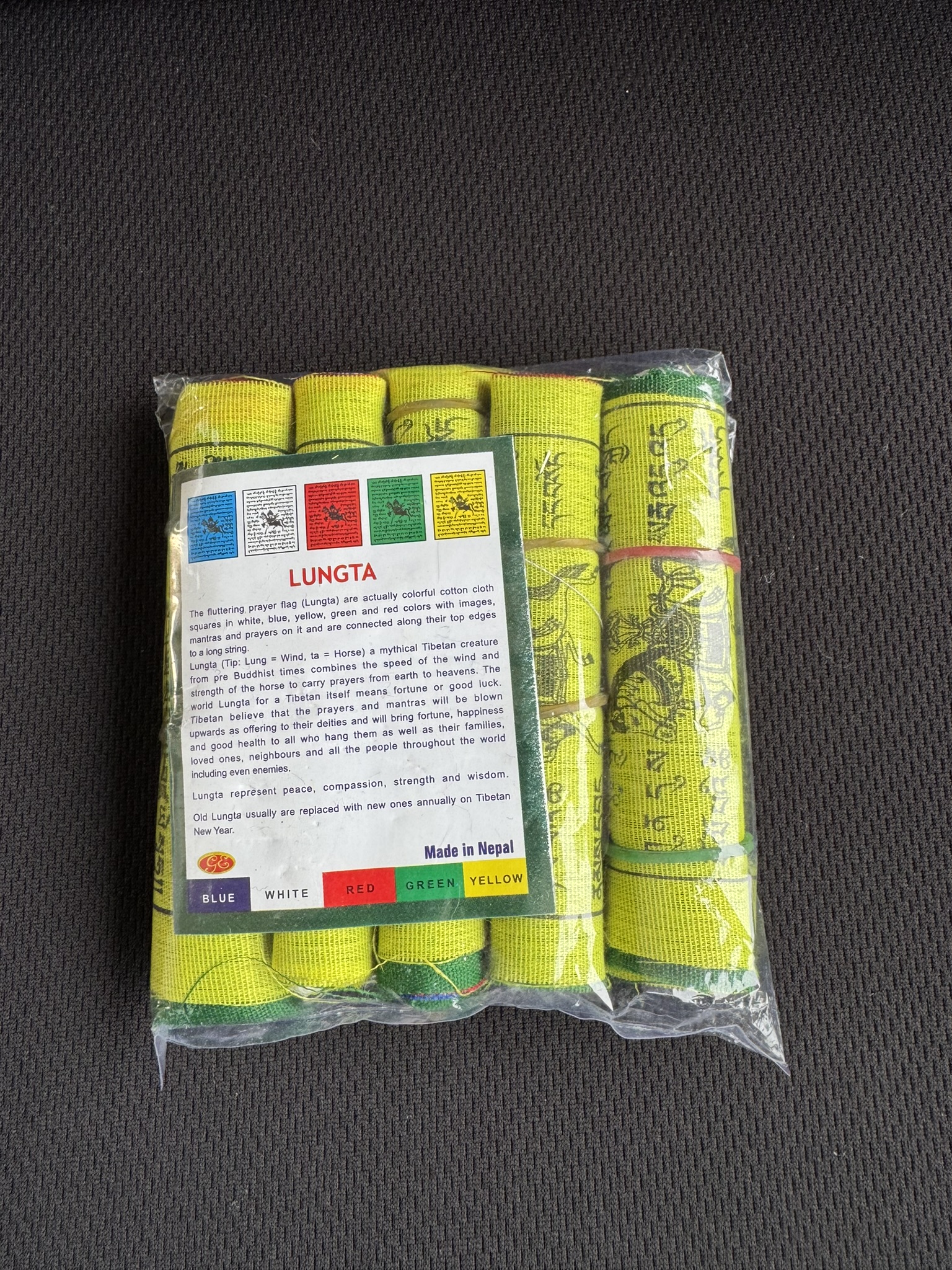 Drapeaux fabriqué par des artisans népalais, ils représentes : Paix, Compassion, Force et Sagesse, Prospérité. La couleur de chaque drapeaux représente le Bleu / le ciel, le Blanc / l’air et nuage, le Rouge / le Feu, le Vert / l’Eau, le Jaune / la Terre. Il doivent être en général placé à l’extérieur, au vent à la pluie au soleil, à chaque fois qu’il se désagrégera cela voudra dire que le mantra qui est écrit sur chaque drapeau, une prière à été transmise à l’univers, vous pouvez également en le mettant faire votre propre demande. Mesures du drapeaux 8 cm x 8 cm x 10 drapeaux environ 80 cm déployé.
