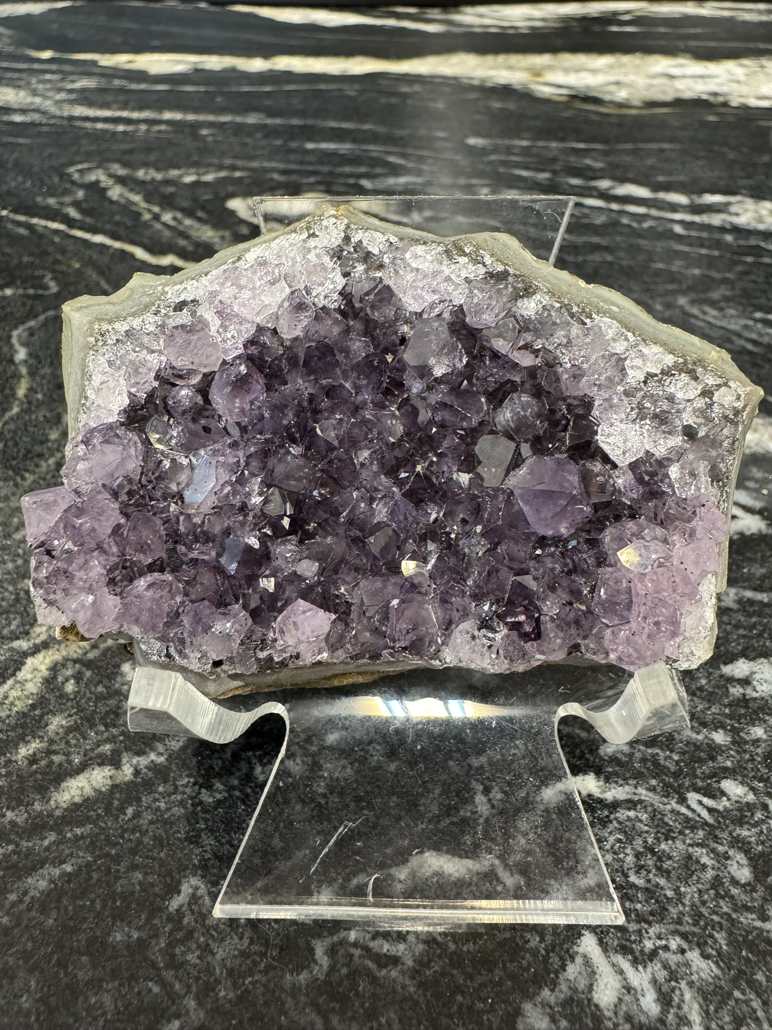 Druze d’ Améthyste claire, elle à cependant la puissance énergétique pour vous apporter le calme et l’apaisement,