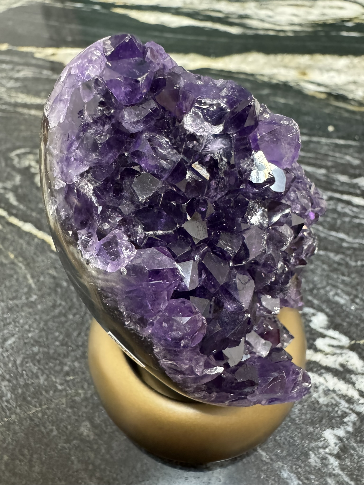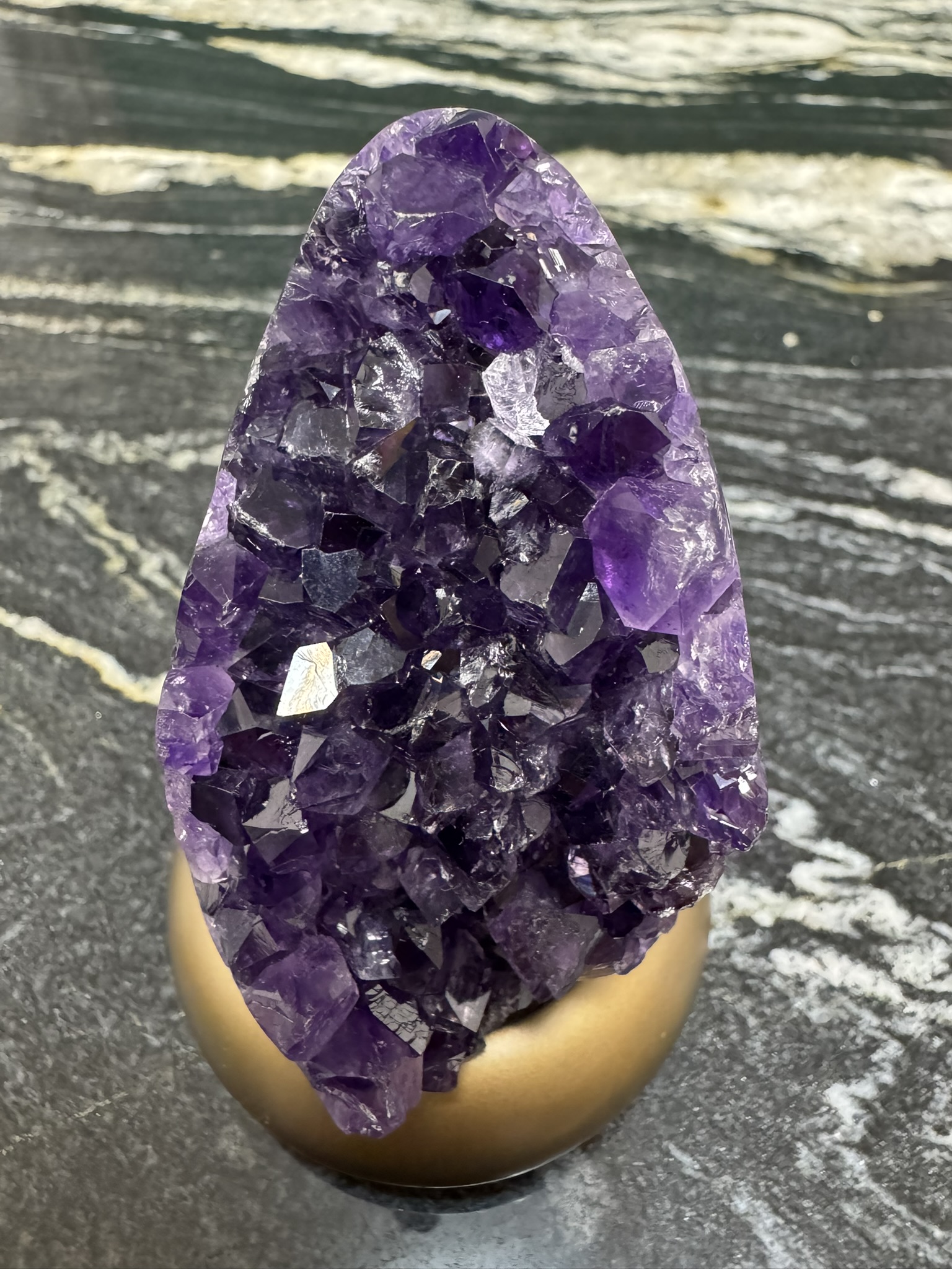 Très bel œuf en Améthyste sur son socle d’une intense couleur violette. Excellente lors de Méditation, elle vous aidera à dissiper les colères liées aux douleurs du passé.