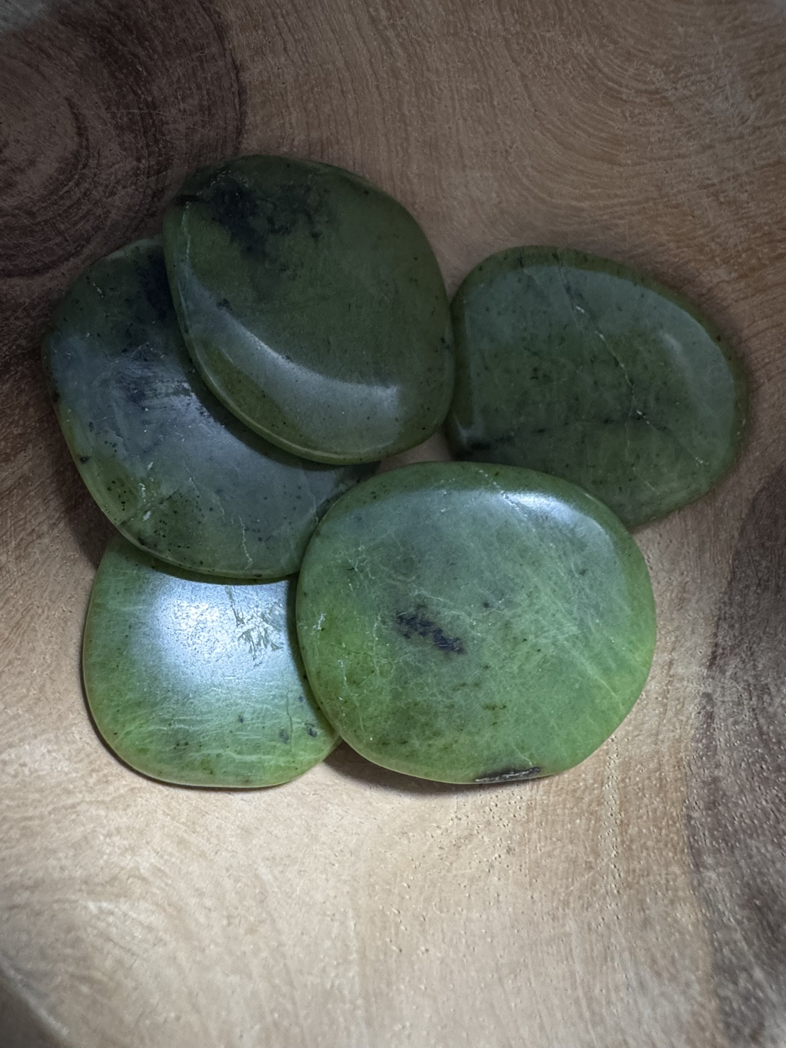 En Asie il signifie prospérité, abondance. Pierres de Lâcher prise. Couleur : vert pâle à vert foncé, noir, jaune. Pierres plates, (photo non contractuelle)