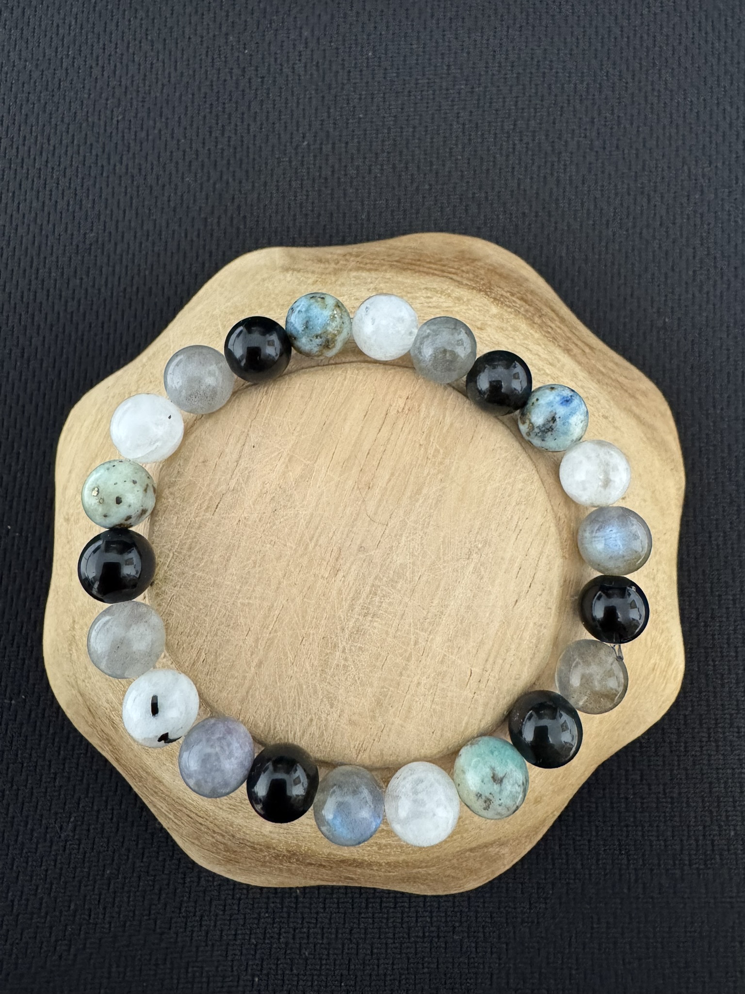 Il est composé de : Labradorite, Pierre du thérapeute, vous protège du négatif d’autrui, la Pierre de Lune, permet la douceur et tolérance, Obsidienne céleste, permet de dégager nos propre émotion, le K2 force et courage dans l’élocution. Nombre de Perles de 8 mm : 22 P