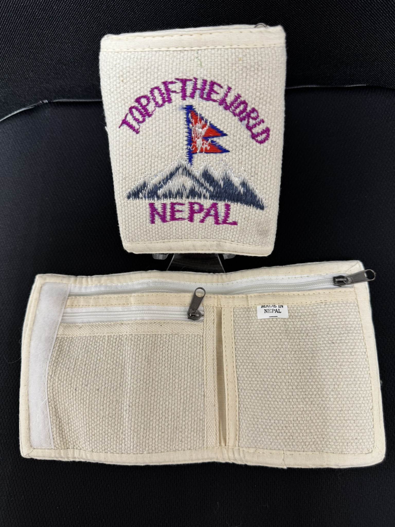 Portefeuille en tissu, fabrication artisanale Népalaise. Mesures lorsqu’il est plié : 12 cm x 9 cm