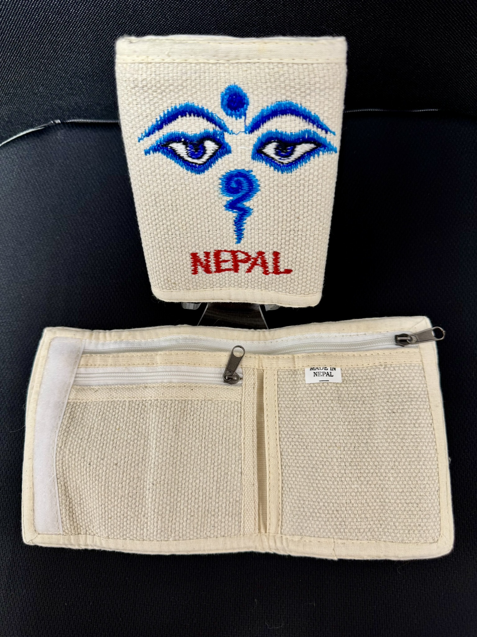 Portefeuille en tissu, fabrication artisanale Népalaise. Mesures lorsqu’il est plié : 12 cm x 9 cm